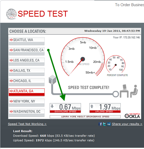 After I posted this article I was checking out the link I put below and wanted to make sure it went to the speed check. Just when I thought it couldn’t get any worse now I’m getting only .67 Mbps. Maybe I should re-consider dial-up again.