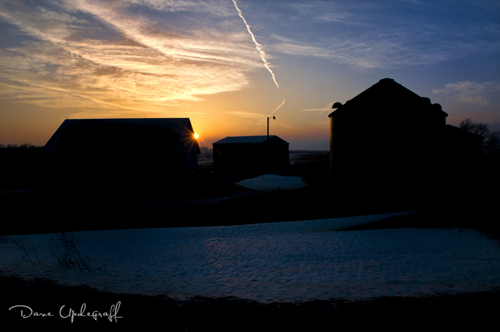 What I found (because I was losing the sun) was these buildings. One grain bin, a shed, and some other structure. So I got a great image of the sun at an optimum moment. Some shots of buildings silhouetted against the evening sky. Not bad for a spur of the moment set up.