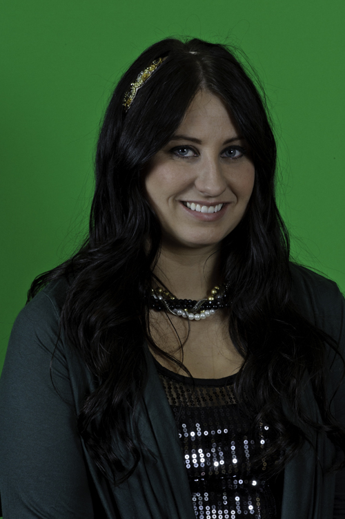 This is Michelle, an employee at the bank. She graciously sat through about 15 shots while I got the lights adjusted. The image above is a RAW image (digital negative) converted to a JPEG file without any white balance, sharpening, color balance, or anything done. Essentially this is how it came out of the camera. The main reason for using a green screen is so that you can replace it (the green screen) with any type of background you choose. It’s called Chroma Key or Chroma Color and you see it a lot in movies, the weather maps, etc. It is widely used because it is relatively easy to separate the subject from the background and replace the background. That is unless your subject happens to be wearing a green outfit.