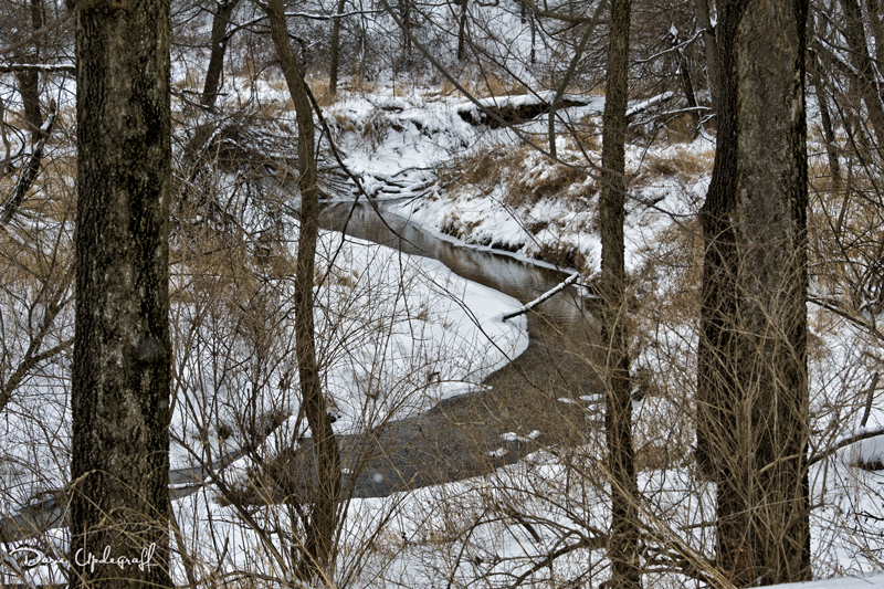 I went out to the small dam in Maquoketa but there was no water flowing so no ice formations around the doors.  On the way out I notice this small stream meandering through the woods and I liked the way it looked with all the trees around.   I tried this image in black and white and it just didn’t work as well as it did in color.