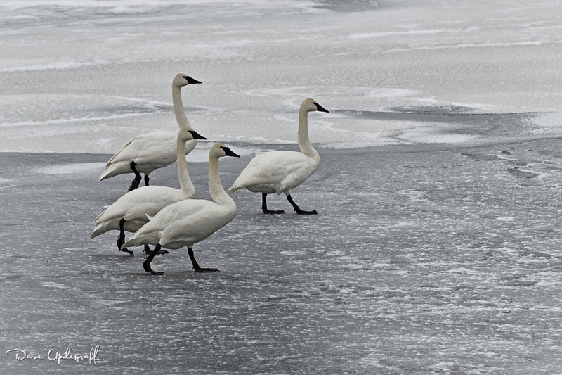 I decided to see if there was anything going on at the  “Duck Pond” and there were 9 swans swimming in a very small patch of open water.  By the time I was able to creep up within camera range they were moving toward the center of the pond (very unsociable.)  So the only thing I could do was grab this shot of one of the groups walking away.