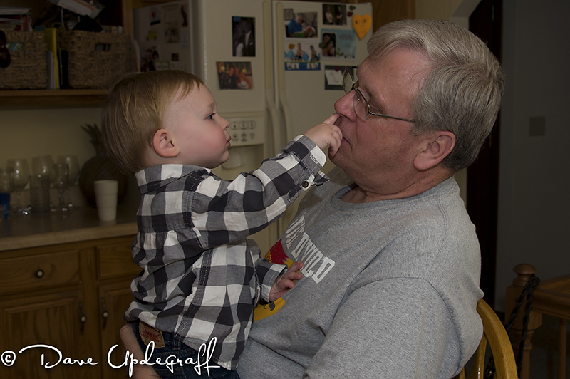 Josh and I was having a conversation and I was asking him where different parts of his face were and then I’d ask him to find the same part on me. Unknown by me Angie had my beloved D3 and captured this moment when I asked Josh where Grandpa’s nose was. It looks like he is sticking his finger in my nose but actually he just missed. 🙂