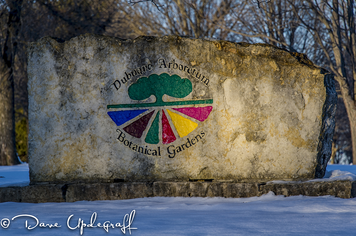 After shooting the little ducks at the 16th Street Basin I decided to put my trusty 28 – 300 mm lens on and drive over to the Dubuque Arboretum to see if there was anything worth shooting. Lots of snow cover but when I pulled in the front entrance I liked how the sun was reflecting off of the main sign. I was the only person in the Arboretum so I got out and walked around a little bit. The trails were covered with snow so I didn’t venture down any of them. Just walked around the parking lot a little.