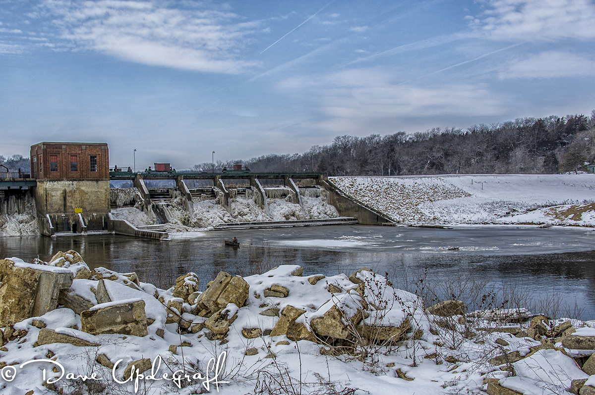 We had about a half hour before our lunch break was over so we drove out to the Maquoketa Dam. I don’t think I have ever seen such a build up of ice at the dam. I was also surprised to see this man fishing in his boat. I captured a similar image a few weeks ago but thought the water would have still been frozen over from the last cold spell. I like the perspective of the shot above.