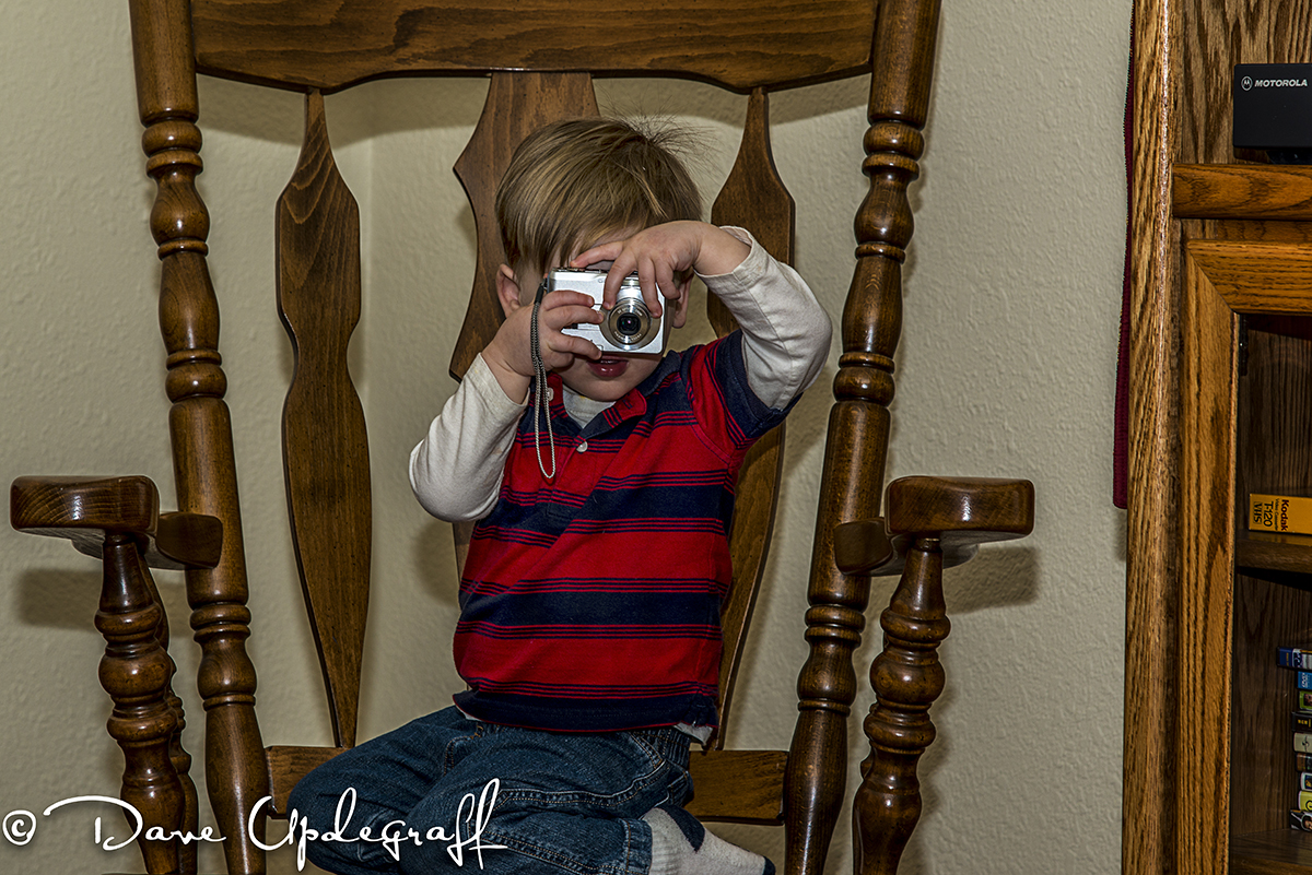 Mama Jeanne gave Josh her old point and shoot camera to play with. After she turned it on for him he ran over to the “big boy” rocking chair and practiced his technique.