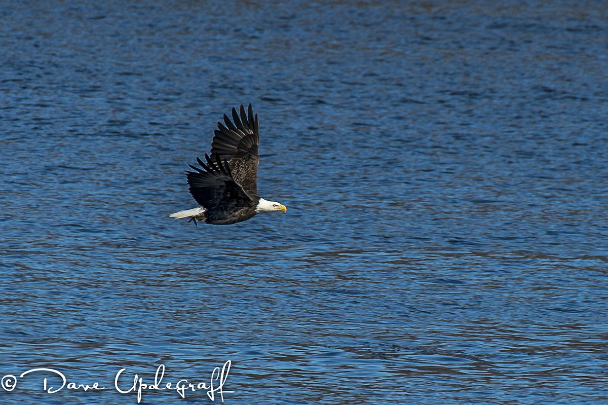 Then I saw an Eagle fly from the far tree line to the middle of the river, swoop down and land in a tree just above the street closer to the dam. I drove up to the area and parked. I couldn’t get a clear shot of the eagle because there were too many branches so I decided to get closer from a different angle. I was sure glad I did. I got a wonderful image of him in the tree surveying the river Click here to see that image. He tolerated me for a long time and then he took off. My first thought was, well he’s gone. No he had just spotted a fish and was on his way to catch his lunch.