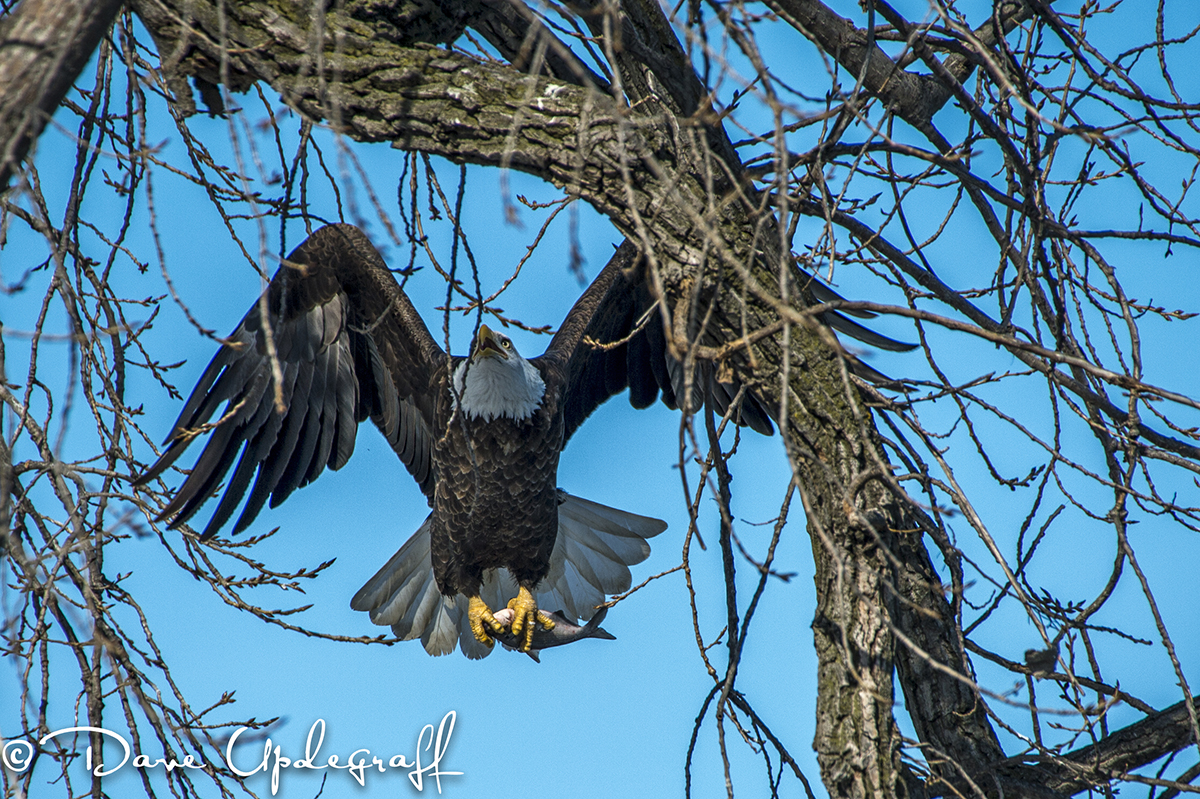 Good Day. Thanks for stopping by the blog. A quick post this morning and of course it is another eagle image. There may be a lot of things wrong with this image but I feel so lucky to have gotten it. There is a lot of distractions in the frame that could have thrown off the auto focus (all the small branches) but I was lucky enough to get a sharp image of the eagle and his catch of the day. He landed in this tree just above me and proceeded to devour his catch.