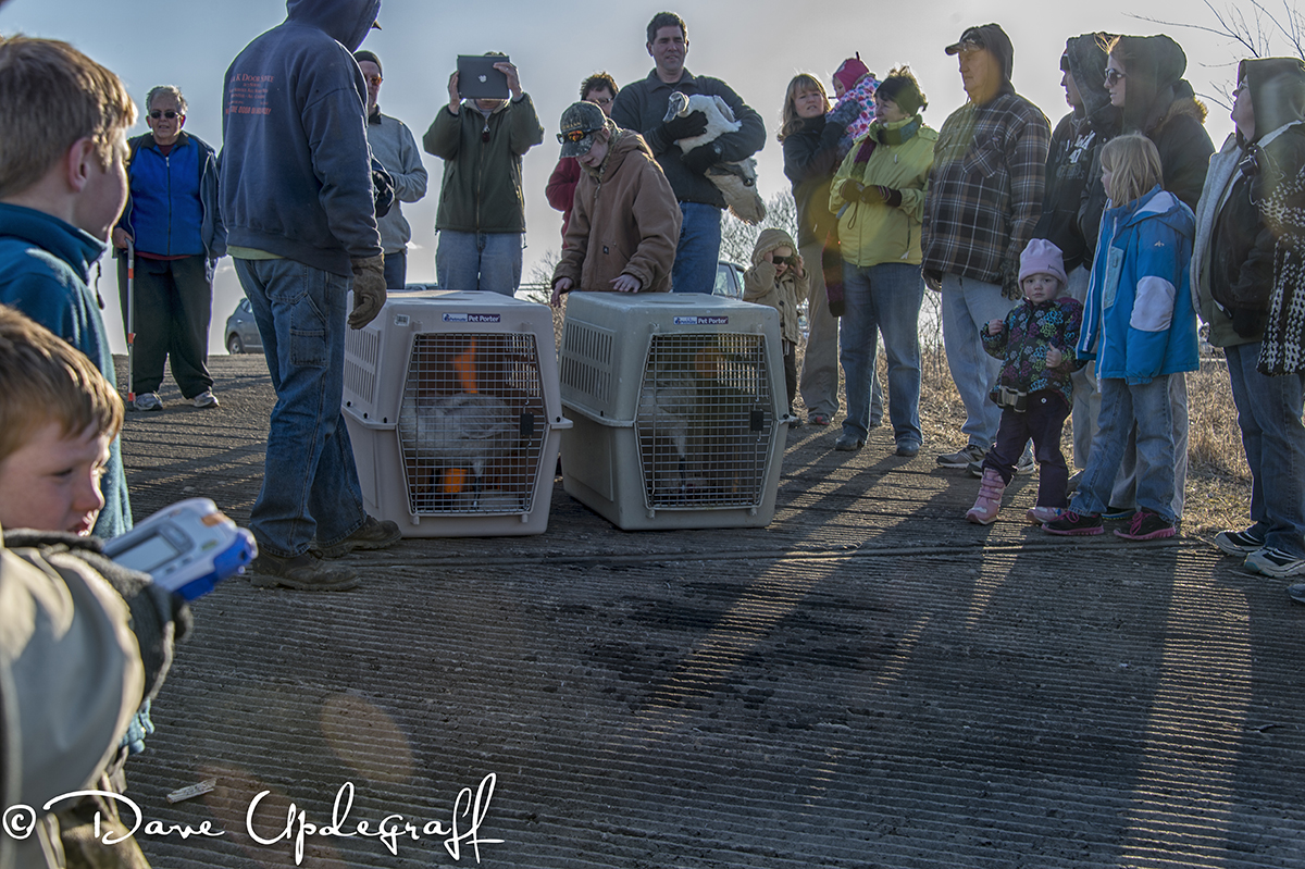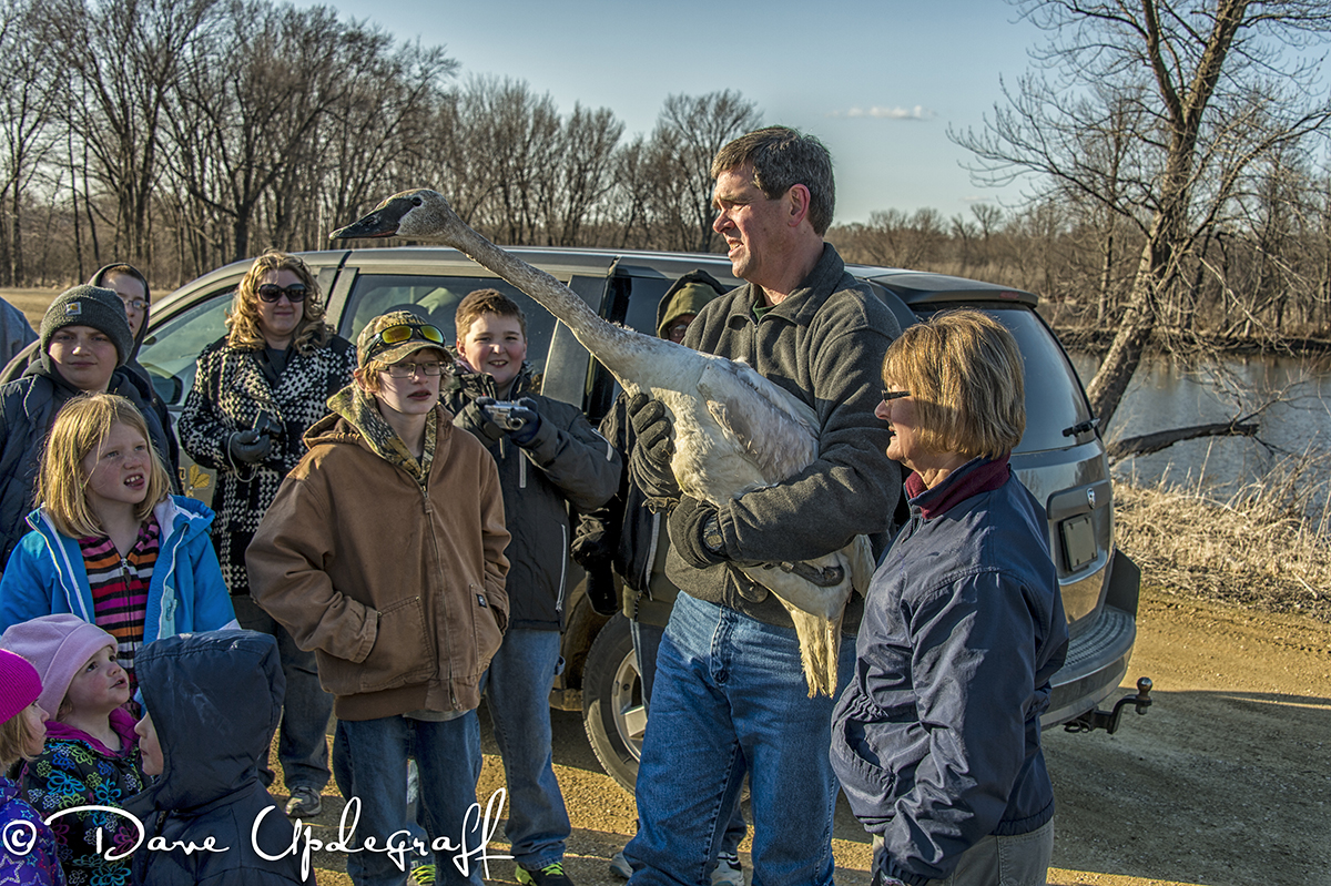 Enjoyable event late yesterday afternoon. I left work about 30 minutes early and drove down to Green Island to watch and photograph the Jackson County Interpretive Center release 3 swan cygnets back into the wild. Shown in this image are my friends Kevin and Ann Burns. Ann is a Naturalist for the Iowa DNR and Kevin works for our organization. There has been a decades long project in Iowa to reintroduce Trumpeter Swans back in the main wildlife echo system. They at one time were almost extinct and have since been brought back from the brink by efforts like the one at the Interpretive Center.