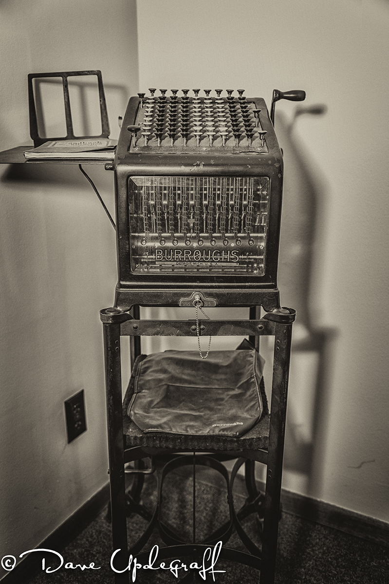 I was at one of our smaller branch banks this week and although I was vaguely aware of this great old bank posting (adding) machine I had forgotten about it. This time I happen to have my camera with me so after my meeting I took a few minutes to look over this piece of history and capture a few images. The book beside the machine is the original handbook of instructions. The machine itself weighs 63 pounds and I have no idea what the metal stand (specifically built for the machine) would weigh.