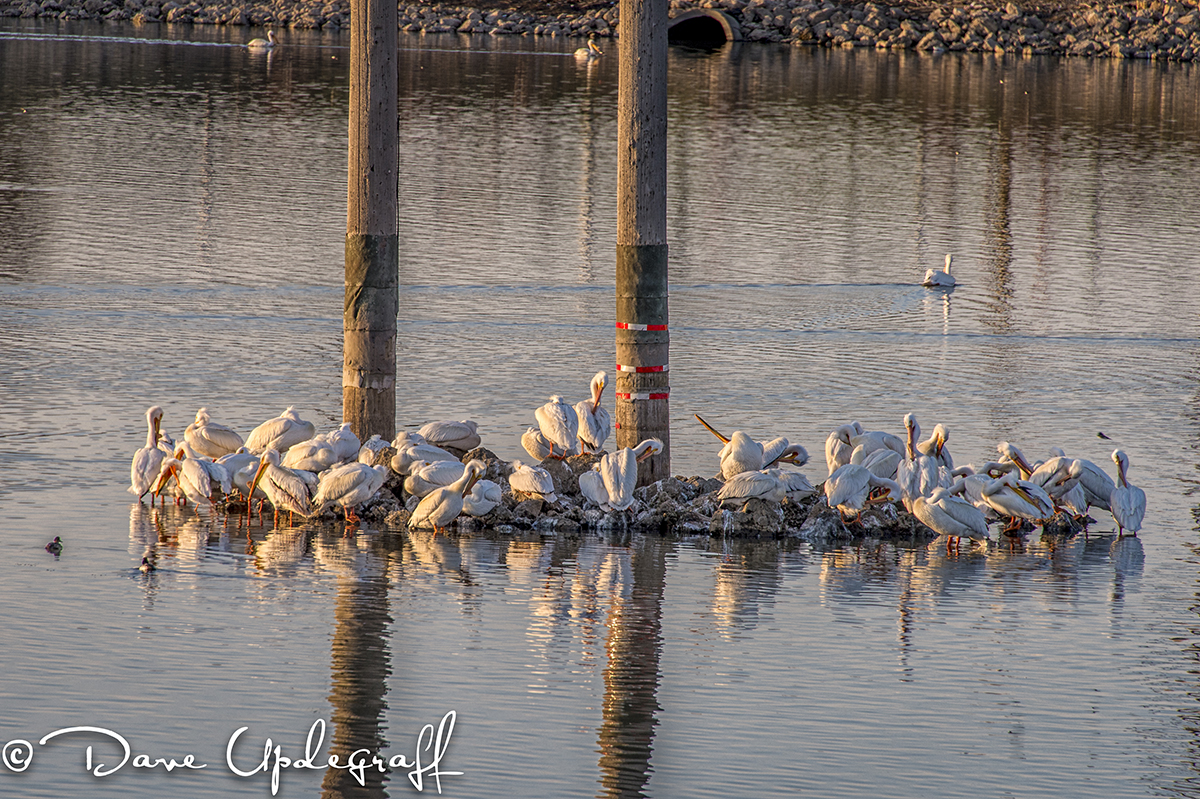 We were blown away with what we saw. Hundreds of pelicans, lots of ducks, blue herons, and coots. I have never seen so many pelicans. They all had this strange growth on their bills. Here’s what I learned with a Google search. “White Pelicans are one of North America’s largest birds and have an 8-9 foot wing span. They are pure white with just black wing tips and a large yellow-orange bill. During breeding season, they have pale yellow crests and a flat rounded horn-like growth on the ridge of their bill. This growth is only found during breeding season and is shed after their eggs have been laid. Immature birds are paler with a gray to flesh colored bill, pale orange legs and a brownish color to the wing tips. They have brownish eyes and have a gray-brown patch on their heads and neck. They resemble adults by their second year. They are larger than the Brown Pelican and males are larger than females.”