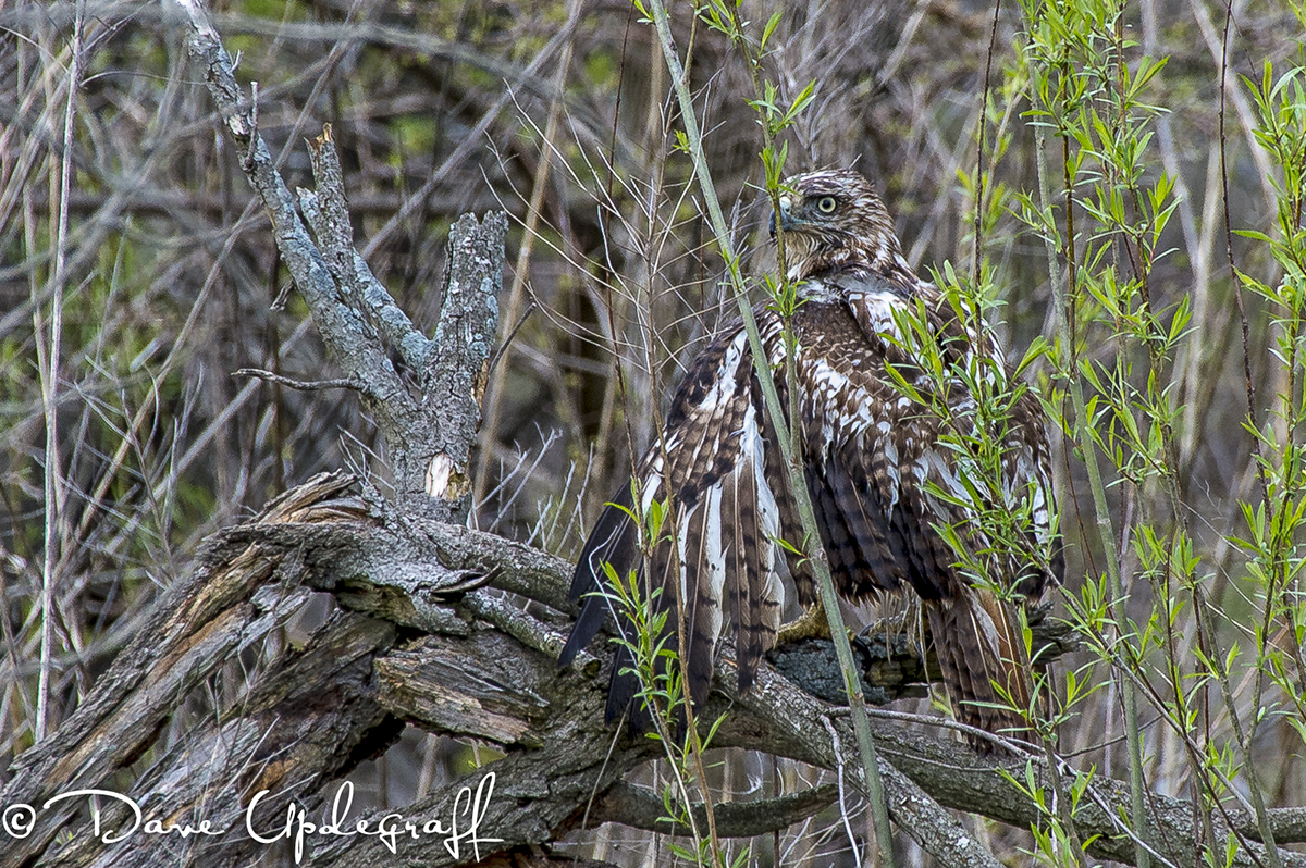 Sometimes Nature can be sad. This red-tailed hawk has an injured wing (or at least it appeared to be his wing.) We watched him for quite a while struggle in the brush trying to get away from us. He more climbed and clawed his way onto this tree than fly.