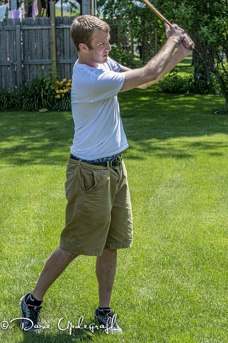 He was going to play golf with Taylor and her family yesterday at Thunder Hills and wanted some golfing tips. He was practicing his swing in the back yard when I took this image. I have several new holes in the yard now. 🙂