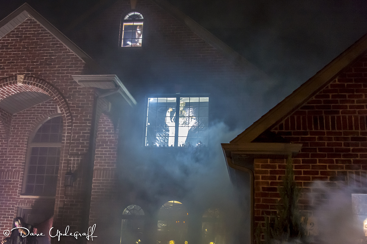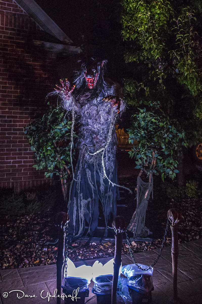 First I was amazed at the traffic jam around the house, with all the people parking their cars on a fairly narrow street and the large crowd that had gathered in front of the house. So then there is the house itself. What I would call a major house that is two stories high and wide enough that I could hide out for a week if I wanted to. Now add fog shrouding the house from various smoke machines embedded in the ground, strobes everywhere and giant monsters popping up complete with sound effects and animation. There were horrifying scenes of carnage in every window of the house and they would play like a carnival sideshow and then darken for awhile so that you attention was drawn to the next scene. There were also scenes out in the lawn that were dark until it was there turn to preform.