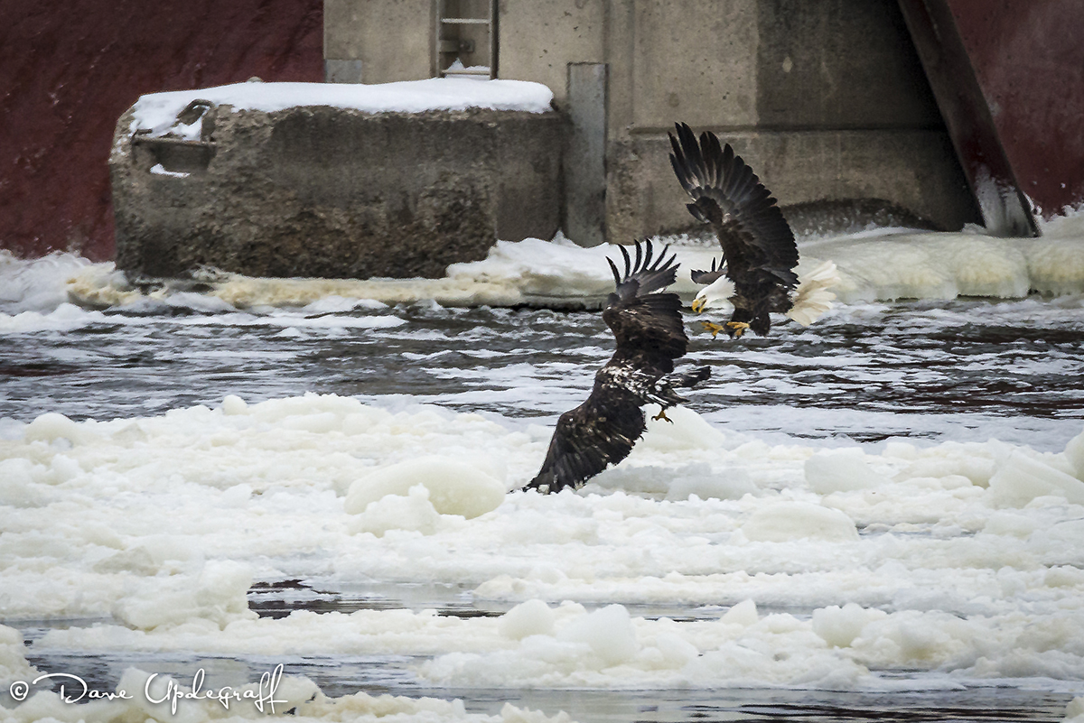 Happy Hump Day. Short post today. This is one of the images I captured from the lock and dam on January 4th. These two battled for several minutes and finally the juvenile gave up and flew away. Once he did that the mature eagle landed near this spot and just sat there. So apparently they were fighting over a small piece of ice on which to stand. We humans tend to do the same thing. In the HR world we call it “turf protection.”