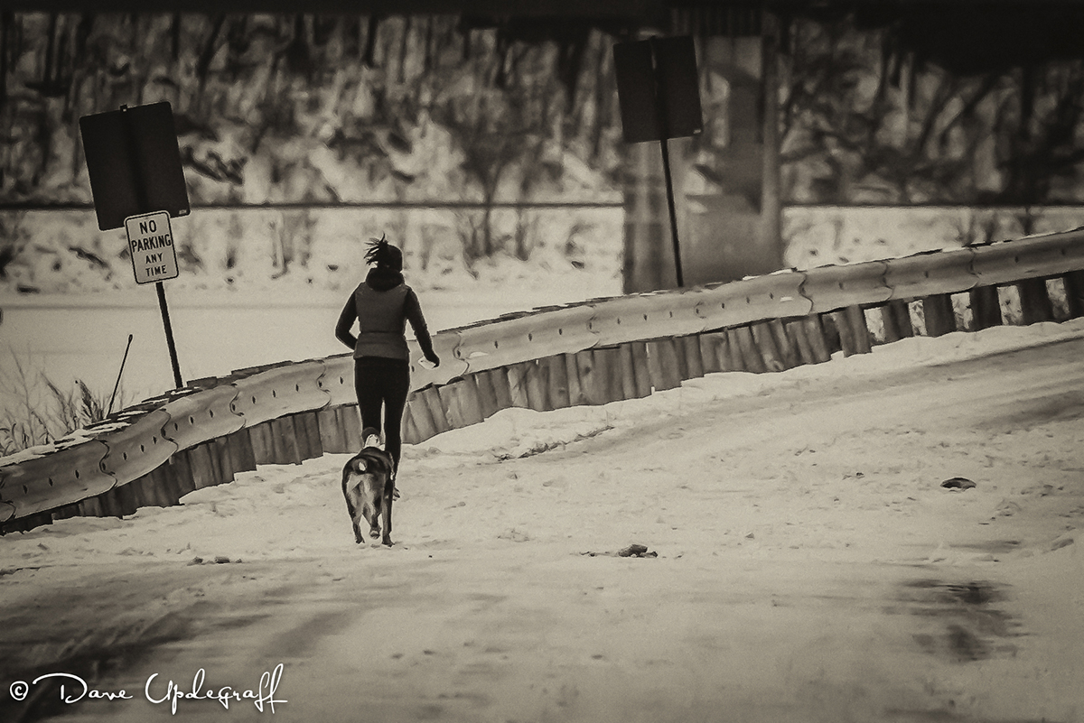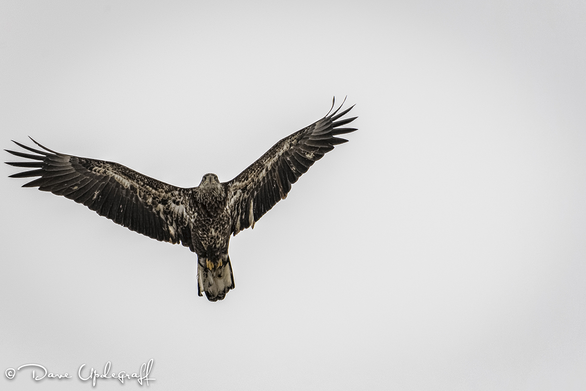 This is an interesting image not from a technical stand point but because of the story behind it. This young juvenile had been pestering the mature eagle for some time. I made a lot of shots of them “dinking” with each other on the ice and occasionally in the air. On this occasion the mature eagle suddenly diverted towards the river and made a great catch of a fair-sized fish. I got the blurry image of him getting the prize but they are not worth showing. Anyway the young eagle was left without any food as the older eagle took his catch across the river to the high bluff trees by Eagle Point Park. Maturity has its benefits. 🙂