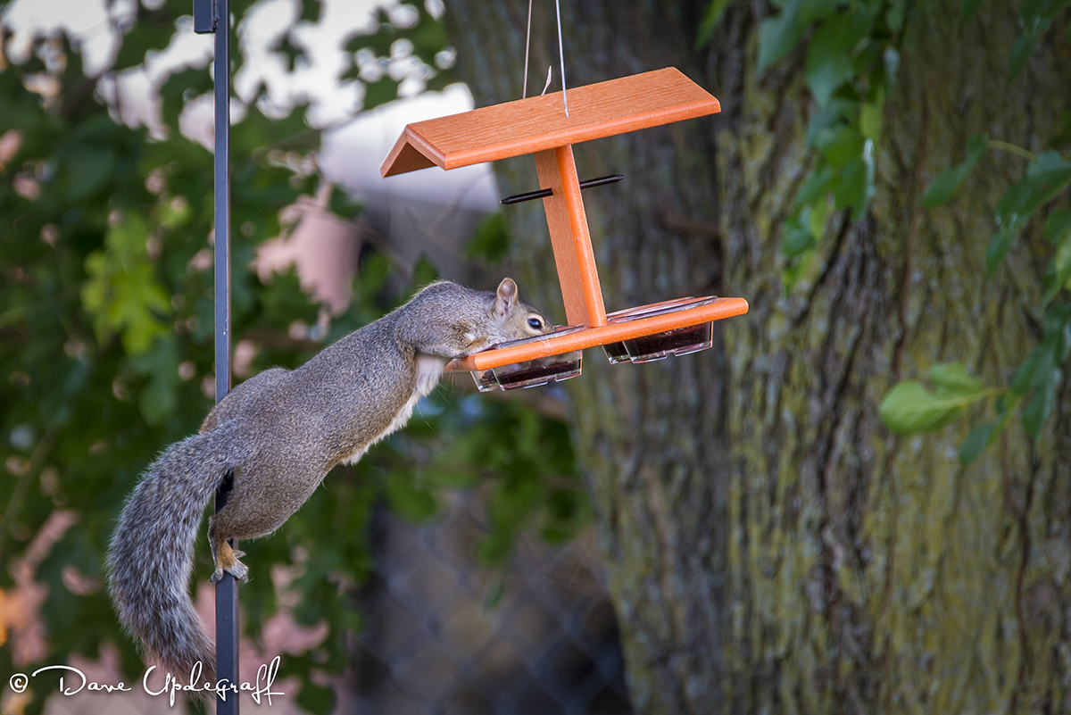 While doing that, my little friend the squirrel came down to feed. I wanted to see him do his vertical leap up to the bird bath but our little dog scared him back up the hill. Before he went to his home he demonstrated that he has figured out how to get at the jelly on the oriole feeder.