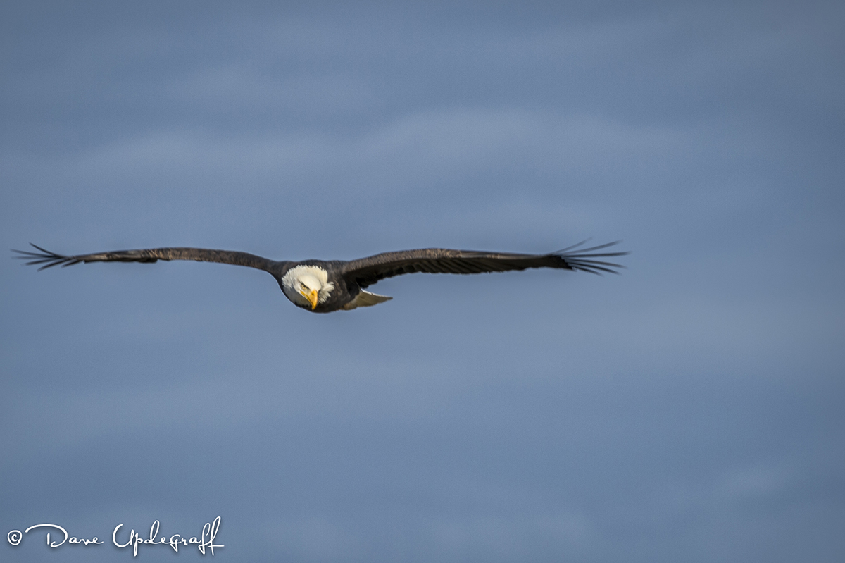 I put the Tamron 150 – 600 mm lens on the Nikon D4, which had the ISO set at 100 in aperture priority and fired away. The fastest shutter speed I got was 1/320 sec at f9. There was no time to make changes. The eagles quickly flew around the area and departed.