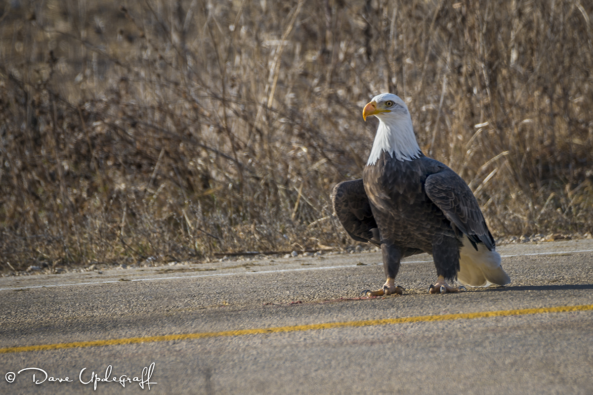 I was taking my normal route to work yesterday morning and in the distance I saw what I thought to be some black birds feasting on some fresh roadkill. As I came over the hill there were three eagles on the highway (not black birds.)