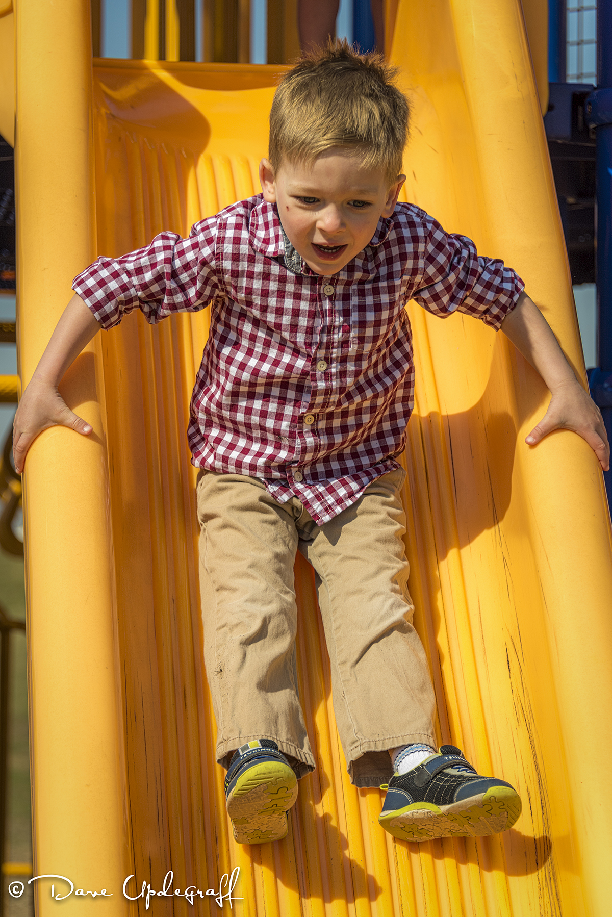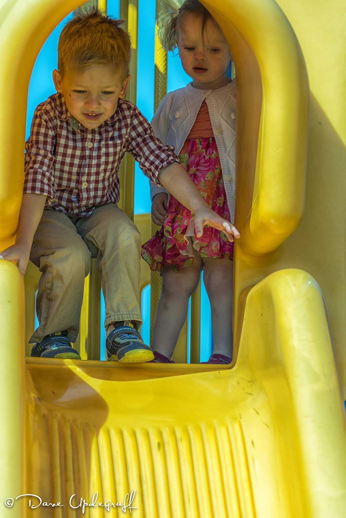 Even though this is the tallest and steepest slide on the play ground Gabby showed no fear and climbed to the top on her own and came down without coaxing.