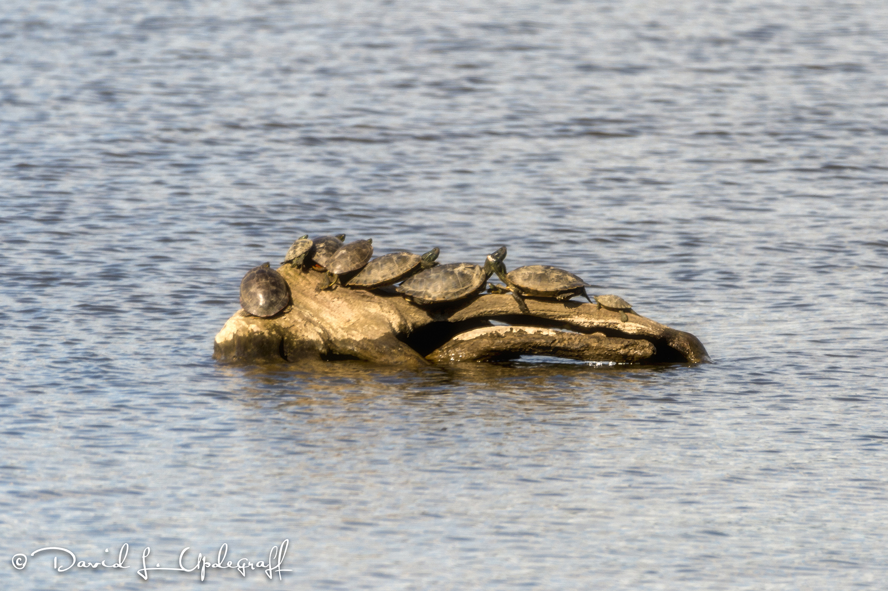 Talk about standing room only. I was at Mud Lake photographing a Blue Heron last week and then took some general landscape photos for my files. Sitting back in the car I enlarged them and that is when I saw these guys. So I put the long lens on the camera and photographed this group. Now that I was aware of the turtles I discovered there were turtles on all almost every projection that was above the water line. Apparently it was a great day for sunning.