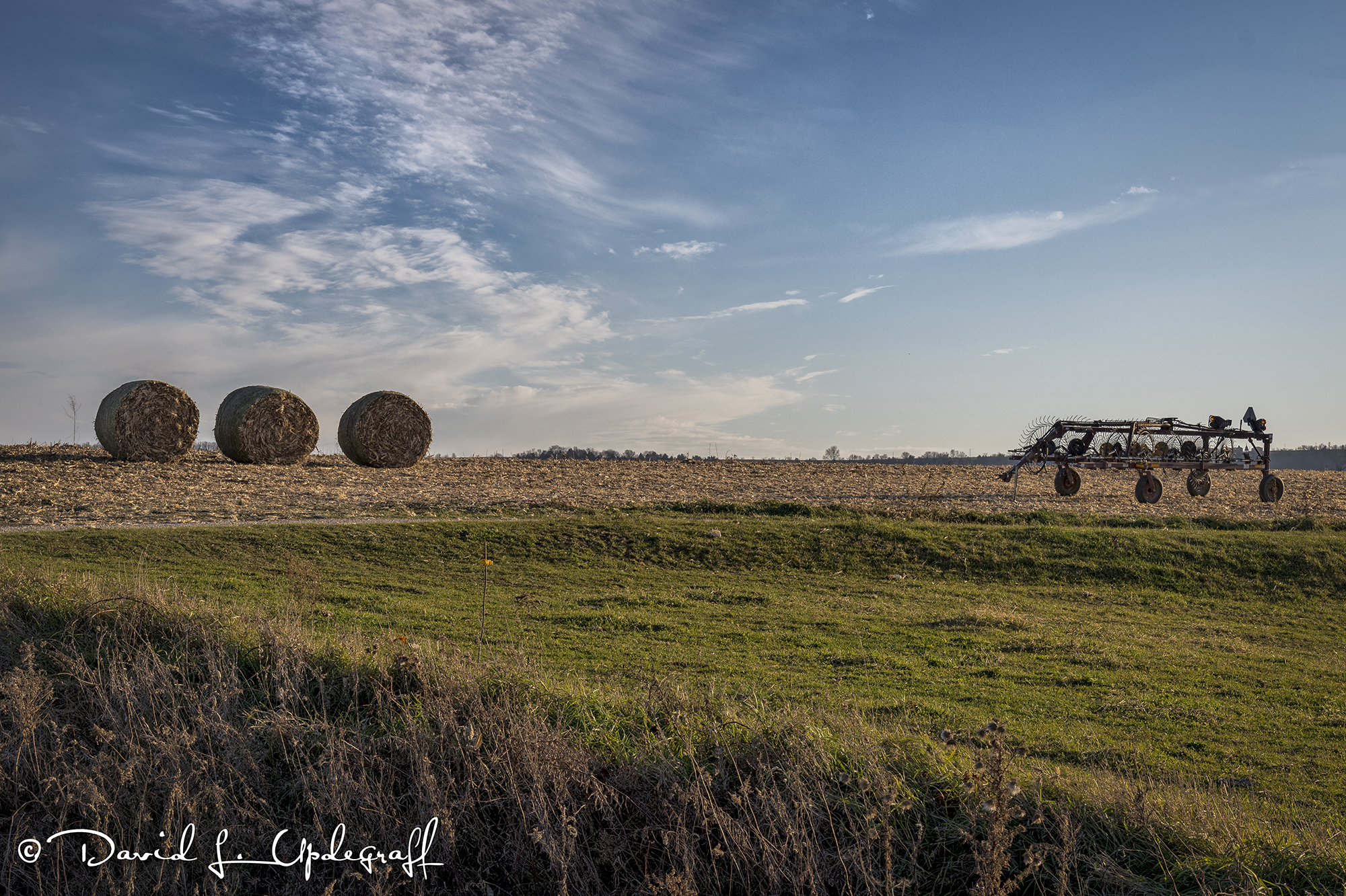 Driving through Clayton County I saw this hay-rake sitting in the harvested corn field along with three bales of corn stalks.  I liked the story it told so made an image of them.