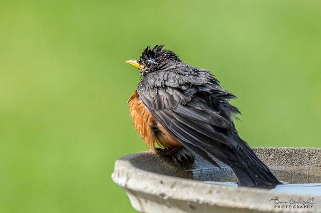 At the end of our patio we have a cement bird bath, which is a real chore to keep clean and filled with fresh water. It it is heavily used by the birds in our neighborhood so I’m happy to do it. I love watching the birds take baths and getting drinks. I captured this robin at the end of his frolicking bath. I wanted to get some images of the water being splashed into the air but for some reason I was having trouble getting focus lock on him. I do like this image however.