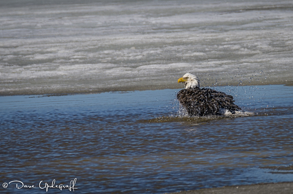 All of a sudden the little gull took to the air and in the blink of an eye the eagle swooped down from his perch and grabbed the little gull’s fish and was off. I have watched this scenario time and time again. The gulls do the work and the eagles get the prize. 🙂