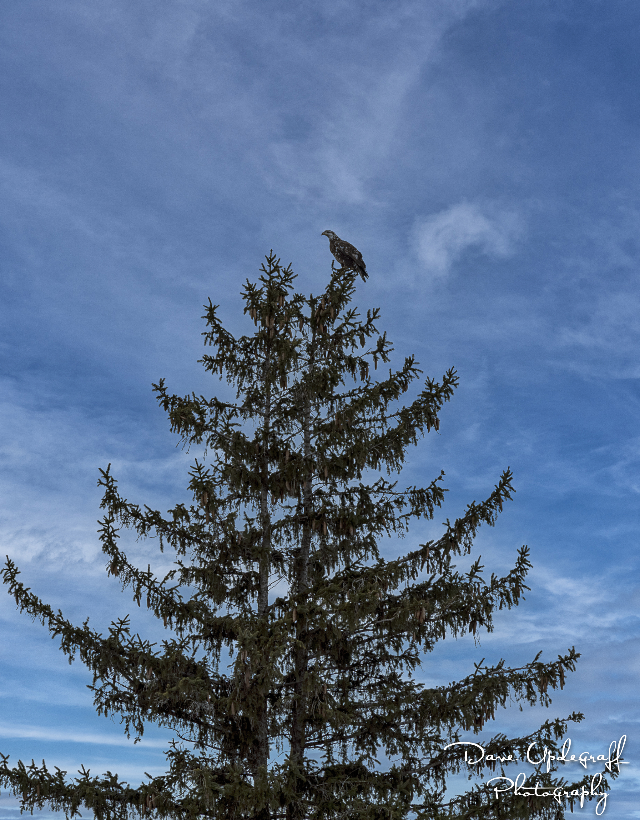 As I turned around and headed for my vehicle I noticed this juvenile eagle perched on top of this pine tree. All I had with me was my Nikon 70-200mm f2.0 so it is not a good image by any stretch, but at least it is an eagle. 🙂