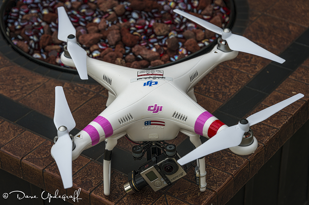About a month ago the Phantom, while coming in for a landing, decided for whatever reason to take off on its own and it crashed into a sidewalk several blocks away. Put a nasty scar on the camera, destroyed the video transmitter, and broke some props but no other visible damage. Jeanne and I scoured the neighborhood for almost an hour before finally finding it. I re-calibrated the compass, put a spare transmitter on it, and it seemed good to go.