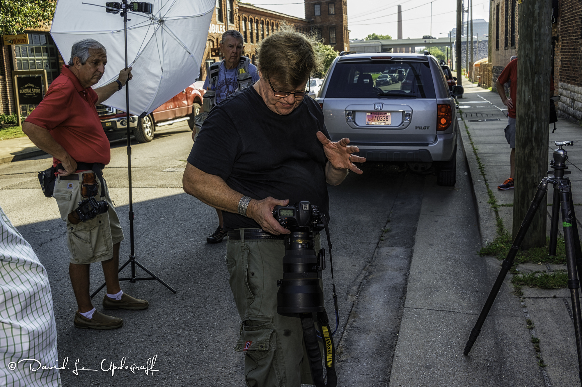 Halfway through the shoot Joe McNally gave some tips on how to shoot an individual next to the cars. The gentleman at the far left of the image (manager of the garage) was Joe’s subject and he took several images of him standing in an Austin Martin. It was a great lesson.